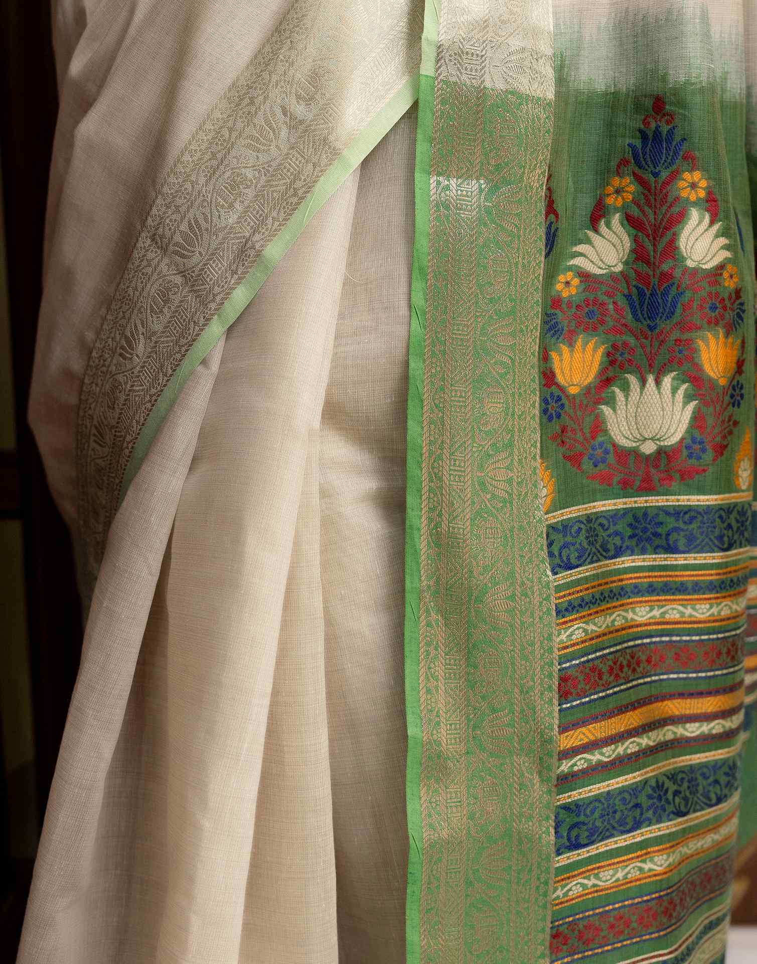 Beige Cotton Linen Woven Printed Saree