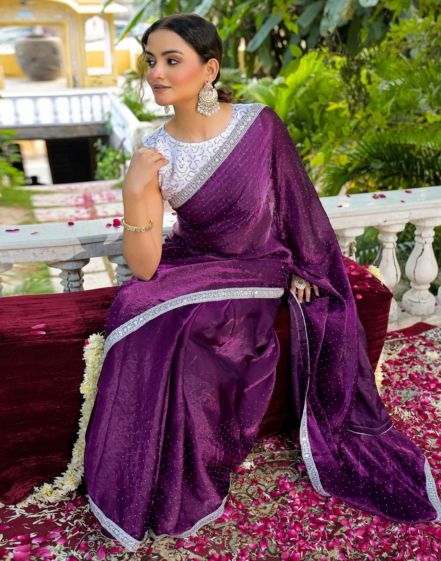 Dark Purple Shimmer Tissue Stone Work Swarovski Saree