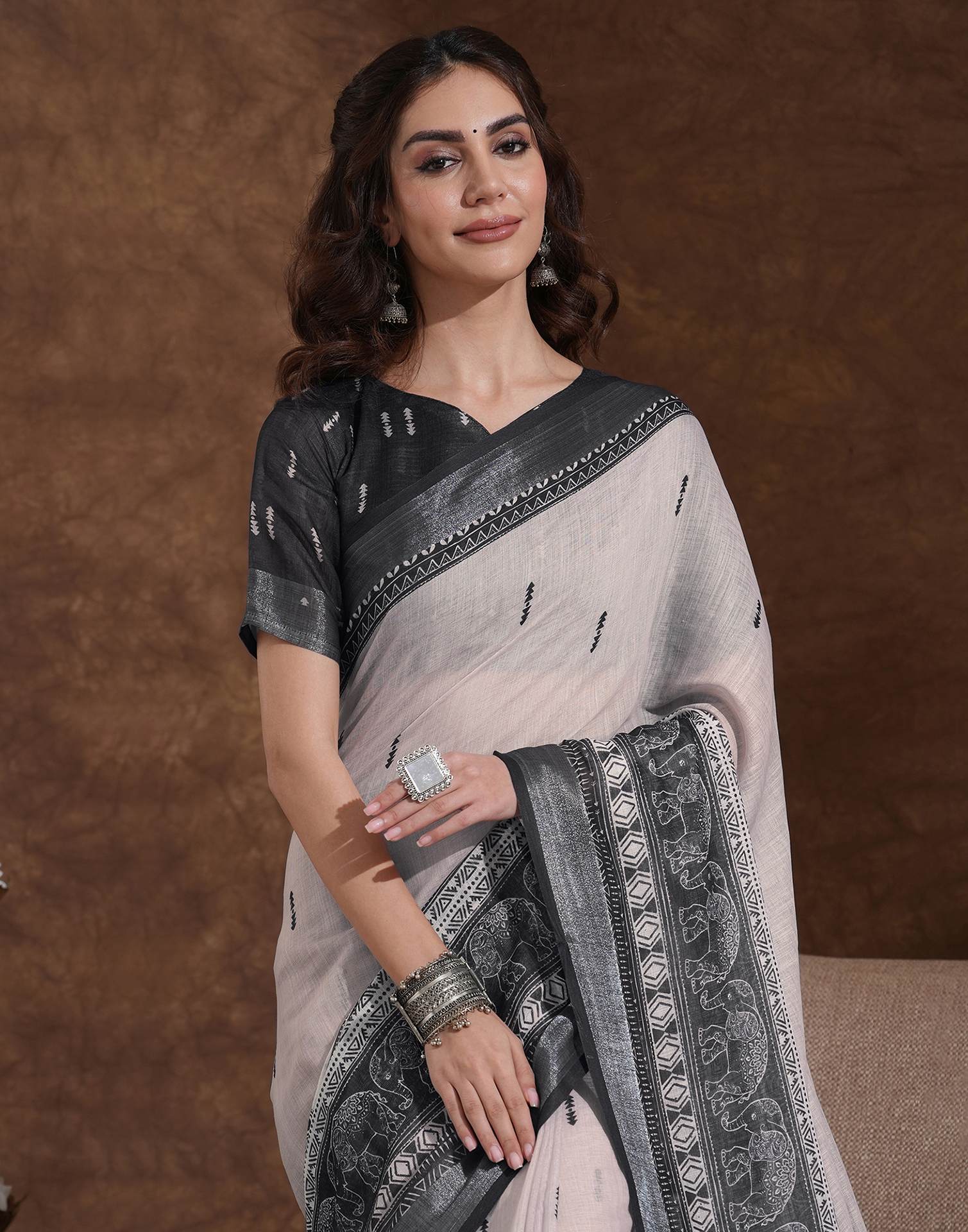 Off White Linen Woven Printed Saree